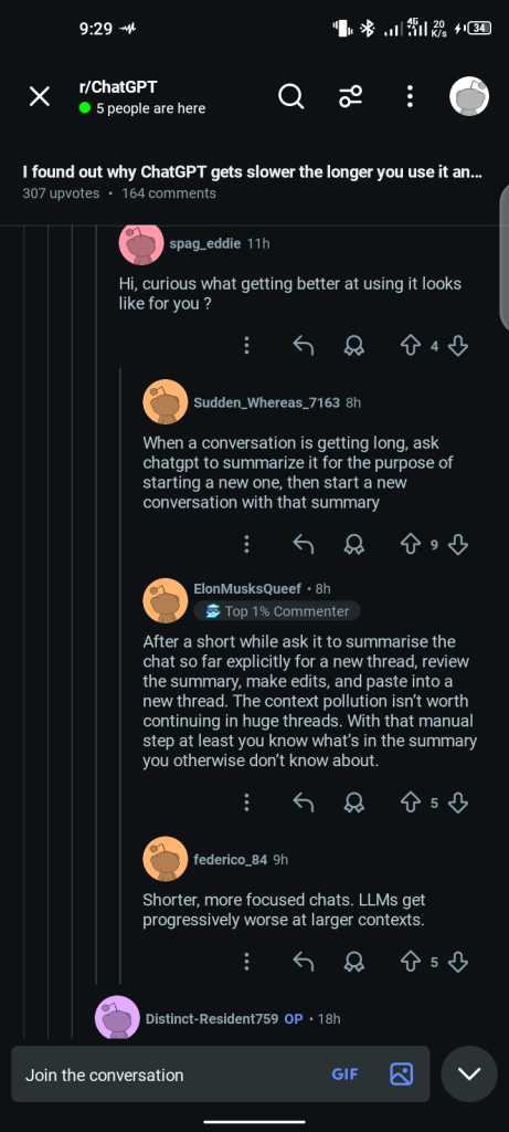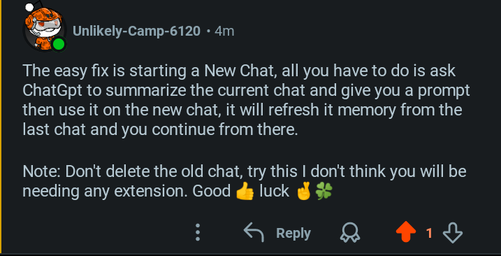 Another set of comments landed very close to the method I shared. They argued that when a conversation gets too long, the practical move is to ask ChatGPT to summarize it for the purpose of starting a new thread, review that summary manually, then continue in a fresh chat.