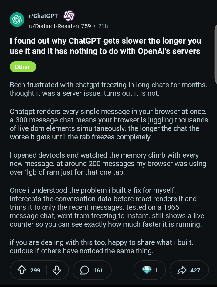 I recently came across a Reddit post where someone argued that ChatGPT gets slower the longer you use it, and that the slowdown is not only about OpenAI’s servers. The person claimed that very long conversations can become heavy in the browser because every message is being rendered, tracked, and managed in the interface. According to the post, once a chat gets large enough, performance starts dropping until the tab feels frustratingly slow.