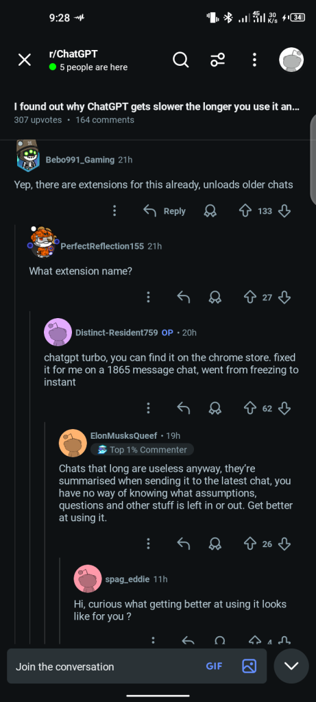 That idea got attention because it matched what many people have experienced. The post pulled in strong engagement, and the comment section quickly turned into a mix of technical explanations, shortcuts, criticisms, extension recommendations, and practical advice from normal users who just wanted their chats to stop lagging.